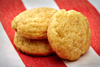Trois biscuits au sucre sur une nappe rouge et blanc.